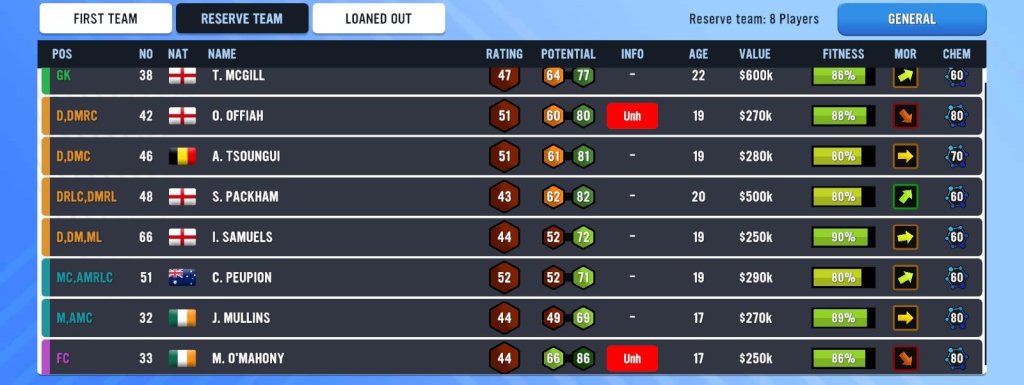 We’ll end today’s blog with a brief overview of the reserve team and loaned out players. These two areas are where you will tend to have your youth players as well as any first team player who is not in contention for your 25 man squad.