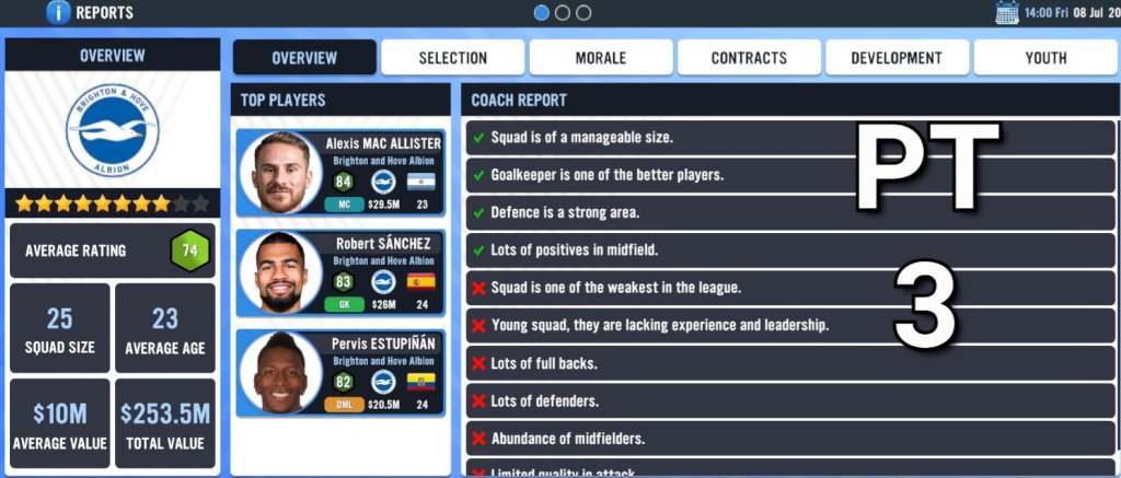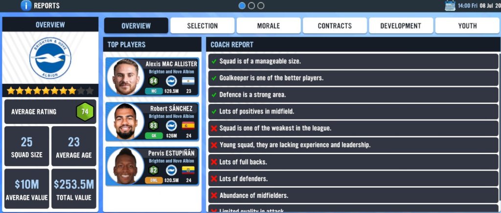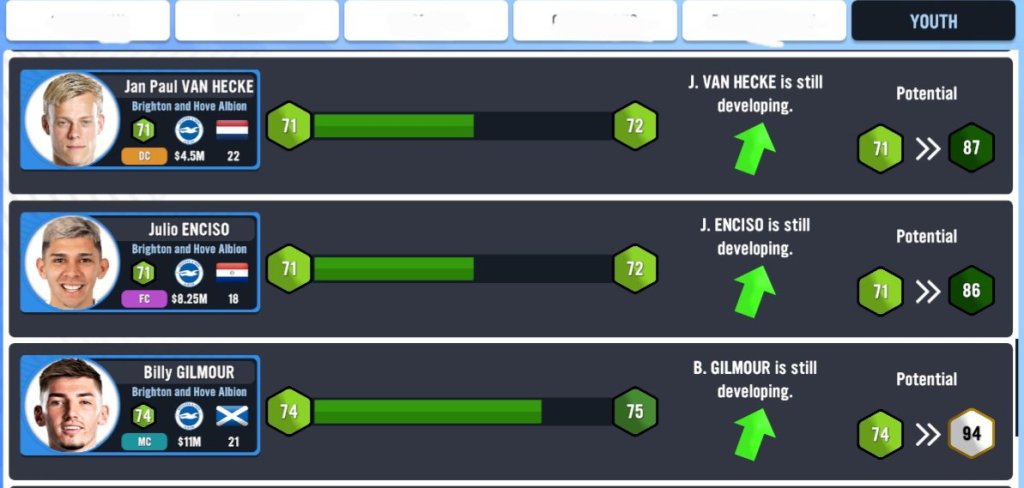 Development is where you get to look at the players who are performing the best within training. I have not performed a training session as yet, but I will be doing that live in a future episode when we break down the ‘Training’ facility.Here is where you can check out the best youth players within your entire squad (both first and reserve team players). Based on this list, I must say that Brighton has some seriously good young players who I am itching to start using throughout the season as I am a huge fan of youth development!!!