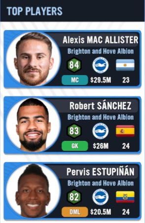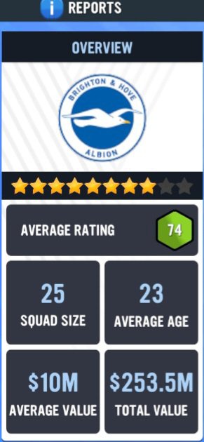 As you can see, Brighton and Hove Albion are ranked 8 stars out of 10 which indicates that they are considered a very good team. The average rating of the 25 man first team is ‘74’, the average age is 23 (which is freaking fantastic), while the average value of each player is $10M USD which means that they are a lot of players within my squad who have a high ceiling in terms of potential. Lastly, the total value of the first team is around $253.5M USDHere are my top 3 players within the squad. Based on what I’m seeing, I have a top Modern Keeper, a baller as a Deep-lying playmaker and a workaholic as a Wing back *rubs fingers birdman style*