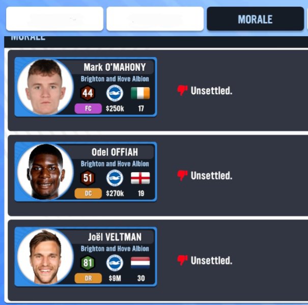 Here is where you can see the players with different morale issues. I currently have 2 reserve team youngsters and a first team Defender who are currently “unsettled”. The 2 youngsters are probably on the lower end in terms of their chemistry, while Joel Veltman is probably unhappy with his game-time from last season. Since I have no intention of making any new signings, it will be imperative that I boost his morale up before he starts to negatively impact his teammates