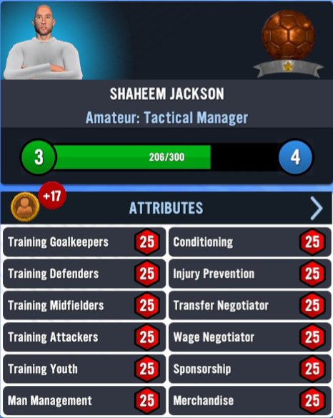 If you take a look at the left of your screen, you will see the image of your chosen style of management (I’ve chosen Tactical), the icon associated with your current level of management, your Managerial level (as well as a bar indicating how far you are from progressing to the next level,) and your current Managerial Attributes which indicate your current ability.