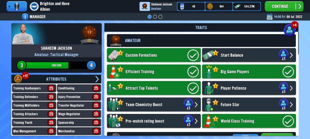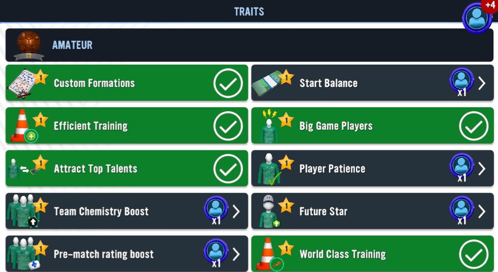 The next half of the page is where you can find your Manager “traits” which is basically the area where you get to improve some of the abilities that you can do via using Manager points which can be obtained by getting good results from your matches.