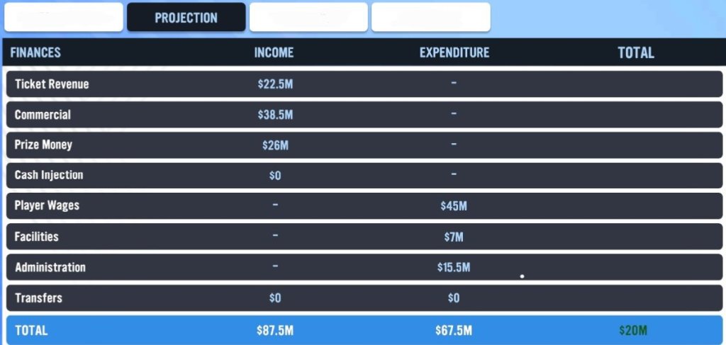 The Projection area on the Finances page is where you are able to locate the total balance that is expected after you calculate your club’s income and expenses after the end of the season. Remember that this amount will continuously fluctuate based on how your team performs on a week to week basis and this is only a projected number for the season. So, in human words (lol), this is where you add and subtract both figures and obtain the final income amount that is expected once you keep up your current momentum throughout the season. (Uhhhh, I don’t know if both explanations are any different 🤷♂️ 😅)