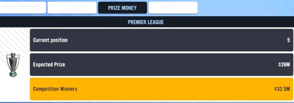 The total for both is placed here in the above image. The income amount at this moment of the season is at $87.5M, with the Expenditure being at $67.5M. Which means that the club is currently in a good place financially with a current profit of $20M. Let’s end today’s episode with a look at the expected prize money that will be obtained from the current competiton that my club (Brighton) are currently participating in. Based on where we currently are within the table (with not a single ball kicked), we’ll be rewarded with a prize money amount of $26M if we maintain our “5th” place position at the end of the seaon, with a further $6M being added to this amount if we end up somehow beating Manchester City (Actually De Bruyne and Haaland and the others…) to the Premier League title. That has to be a mistake since it makes NOOOOO sense that the 5th place team can be $6M away from obtaining what the best team within the league has received….