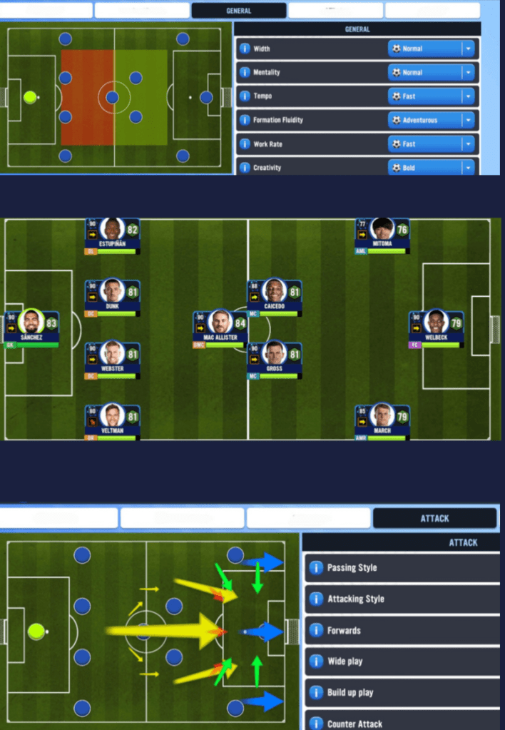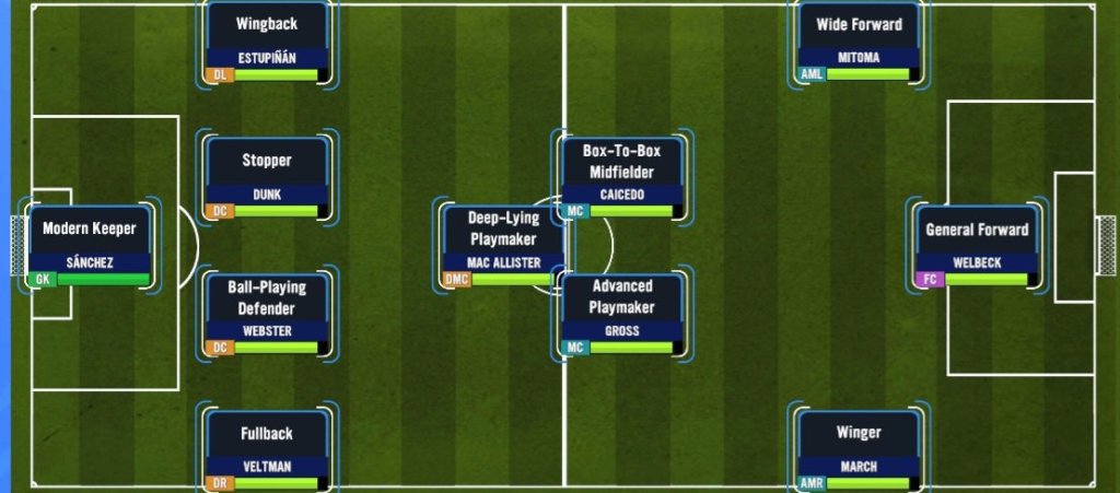 Now, this might not be the best formation based on real life Brighton’s love affair with a back 3, but I personally believe that I will get the best out of this X1 as it offers a decent balance from defence to attack. The only real issue is that Welbeck isn’t a type of Number 9 to play up top alone but I have a plan for how to utilize him to get the best out of him. The reason for the 4-3-3B is to get Mitoma on the field as he is an absolute gem of a player that I am looking forward to using. Oh, and I also had to get March into the X1 since he is one of our better players and has that needed experience from the right.