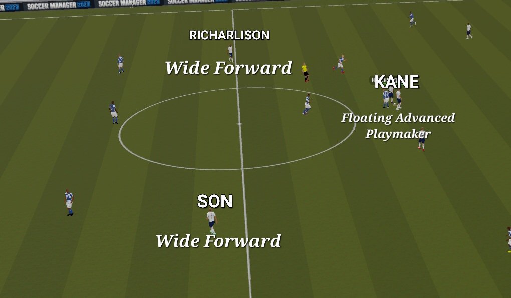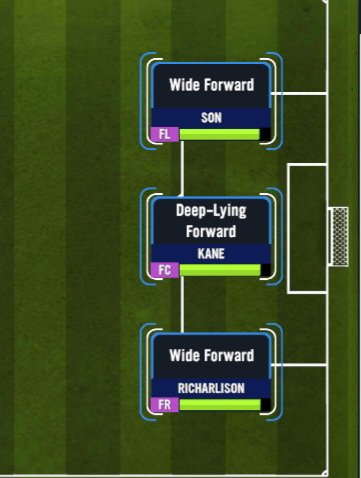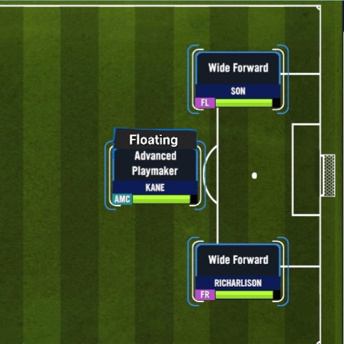 For each player’s role, you should be looking for a combination play between your front 3, so it will all depend on the players you have within your personnel. Just make sure that all 3 can comfortably play as a F(C). For my current front 3, I have the brilliant Harry Kane whom I can play in 3 different roles ( Techincal Target Man, Deep-lying Forward or slightly deeper as a Floating Advanced Playmaker). Harry will look to use his techincal abilities on the ball while Son and Richarlison look to use their excellent movement and explosiveness to attack the goal as my Wide Forwards.
