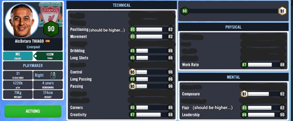 Here are the all too important attributes for Thiago. As you can see, Thiago has a lot of similarities to Marco in that they both have basically the exact same attributes that are around the ’80+’ range. There are some issues with Thiago’s abilities that I am not too pleased with, however. First of all, his ‘Positioning’ should be higher simply because he was a graduate of the La Masia school of Football where positioning was one of the mandatory requirements in order for a youngster to continue on his path to the first team. While his ‘Long passing’ (even though I didn’t make a note of it) should also be higher since he is actually a better overall passer than Marco Verratti. Lastly, his ‘Flair’ is only at ’81’… I mean, this guy is the epitome of elegance, balance, press resistance, and just overall top body usage to get out of any danger. It should most definitely be within the ’90’s’