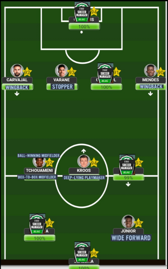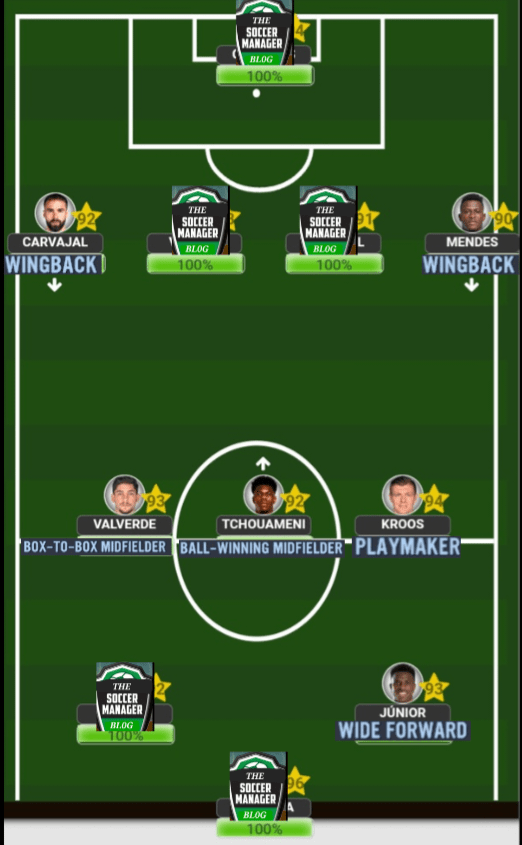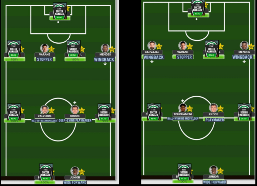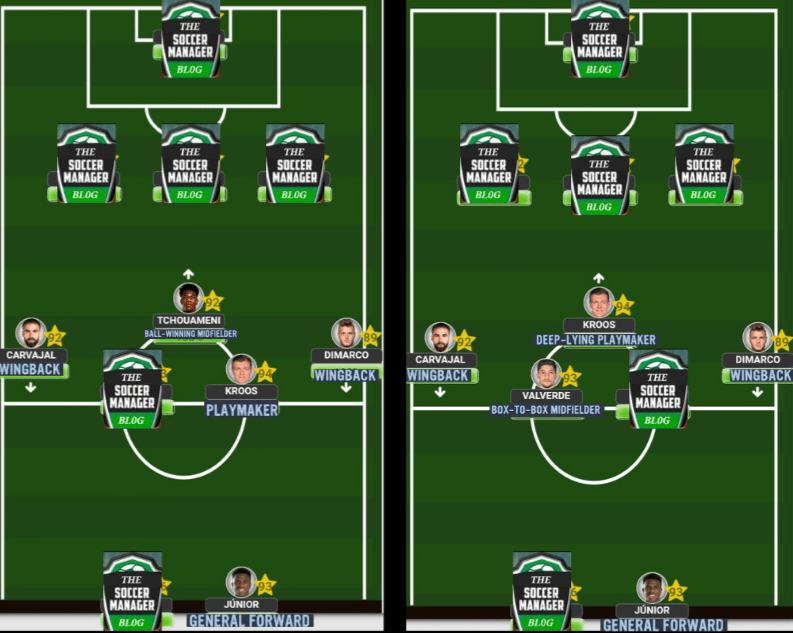 Although I mentioned that Toni is capable as a lone pivot, he is still not a specialized player within that position. So, you will need to add a bit of protection so you’re never caught lacking on the defensive end. Firstly, we need to have a ‘Stopper’ who will simply focus on his defensive responsibilities while always aiming to give Toni the ball in many different scenarios, The’ Wingbacks’ will be the beneficiaries of Kroosy’s exceptional long range passing, while, in the centre of the pitch, you will need a energetic defensive type player who can do the physical side of the game well and aim to give Toni the ball as much as possible. This midfield compatriot can be either a ‘B2B Midfielder’, or a very energetic and physically gifted ‘BWM’. Up front, you will DEFINTELY need to have a top level off the ball operator since Toni is going to find him no matter how difficult the pass will beWhen choosing to play Toni as your ‘no.8’, the same set up remains in terms of the ‘WB’s’ and ‘WF’ or ‘GF’ (if you have no idea what any of these initials mean then check out season 4). The only difference will be his midfield partners as Toni is not a mobile player and will therefore need mobility around him. If you’re playing a middle 3 formation like the 4-3-3A, then both of his teammates need to have high level of work rate, stamina and speed, which is why a player like Tchouameni or a Fabinho will be his best friend in the midfield, but if you chose a BWM like an Anguissa or Rodri (even though both are really good players) the balance will be extremely off since there will be a lack of speed within the engine room. On the other hand, the ‘B2B’ that you choose to play (if you’re using a midfield 3) only needs to have a high level of physical fitnessLastly, we have Toni operating in a back 3 formation. Here is where you have slightly more flexibility in terms of who you choose to play next to him since there is some more defensive protection available in these formations. The same important teammates still remain as he will need a ‘Box to Box Midfielder’ next to him when playing as a ‘DLP’, while he will need a ‘BWM’ next to him when playing as a ‘Playmaker’. The wide players can be any from a ‘WB’, ‘WM’, or an out and out ‘Winger’, but bare in mind that in order to use ‘Wingers’ you will need to have Toni playing as a ‘Playmaker’. Of course, we will need a F(C) who is all about making those deadly runs off the ball to stretch the opposition and cause their defence a whole heap of problems on the transition Although I normally mention this after each formation and players roles, I think we’re familiar with Playmakers by now to know that they will always need to be used whenever we’re playing in a game. If we choose not to use them (especially when it comes to Kroosy) he simply won’t have any other where to fit in due to the fact that he is a special type of playmaker and should only play like one
