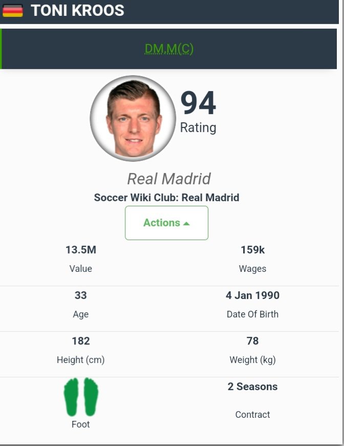 Contrary to popular belief, Kroos no longer has the mobility (as a matter of fact, he never had it in the first place) to play as an ‘8’ in today’s game for an entire season. Because of this, he has adapted his defensive game to be able to operate as a sole pivot in the ‘no.6’ role which gives him that ability to be the hub of possession for his team (something that he absolutely loves to do). Don’t get me wrong, you can still play him as your ‘no.8’ from time to time, just know that you will not get the best out of him and will require to have specific players around him to have him perfroming at his best