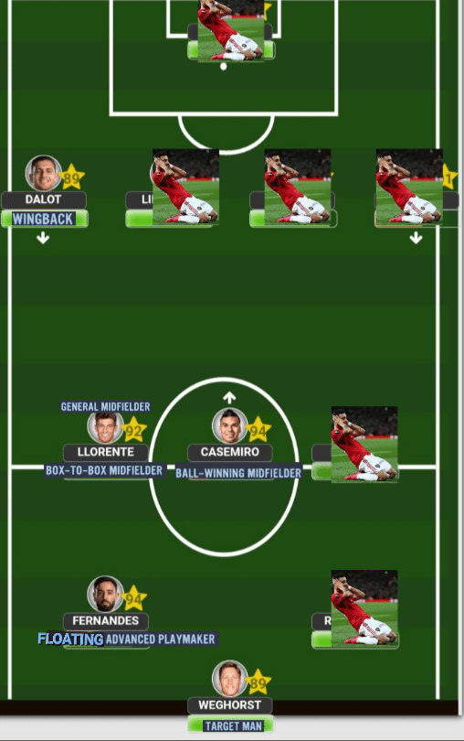 When it comes to getting Bruno playing on smoke, there are 2 non negotiable teammates: A ‘Ball Winning Midfielder’/ a defensive nuanced ‘Deep lying Playmaker’ and a ‘Target Man’. The reason why a ‘BWM’ is needed is down to the fact that Bruno is extremeley offensive and his ego tends to cause him to jump out of position to make runs into the box without thinking about what could happen if the possession is lost (which is fine since without this he wouldn’t have become such a great player). That is why a player who can mop up any counter attacking threat from the opposition is needed and why Casemiro is currently a United player; Since Bruno loves to attack the box, he will need a player who will pull defenders near them to open up space for him to get into (Bruno’s best spells at United occurred when Lukaku, Weghorst or Cavani was upfront); Let’s not forget that he is still one of the best though ball passers in the game, so you’ll need a player outwide who is ready to make those dangerous runs in on goal which is why Rashford is perfect for Bruno. Lastly, Bruno never wants to be used as a playmaker, so we should never tick the box if you put his name in the slot, and it also means that you will need to use a ‘Target Man’ for Bruno’s attacking abilities to come to the front. When choosing to play Bruno in a Midfield 3 it is important to give him the license to get forward from this position which means that a ‘Ball Winning’ Midifelder will be crucial; a ‘Full back’ who will not overlap that much is also important; a ‘Winger’ who hugs the touch line and never wants to get into the same positions as Bruno is also key (although Sancho is a bad example of the type of ‘Winger’ you should be aiming for), and of course a ‘Target Man’ who will allow Bruno to make those late runs into the box.There might be some of you out there that want to experiment with Bruno in that outwide position, and if you do, just remember that he will in no form play like a ‘Winger’ or ‘Wide Forward’. So, he will need an attack minded ‘Wingback’ who will provide the width and allow him to go infield, a ‘Ball Winning’ Midiflder to protect the back line as well as cover for the bombarding ‘Wingback’, and if you want to unlock Bruno even further, playing a ‘Box to Box’ or ‘General’ Midfielder is a great way to ensure that Bruno can solely focus on his attacking gameIn this 3-4-1-2 formation, Bruno is operating as the ‘no.10’ in behind the front 2 and in this position, Bruno will run riot and showcase his creative abilities with 2 F(C)’s eager to benefit from his passes, while your ‘BWM’ cleans up the dangers on the break and ‘Wingbacks’ outwide provide the width which frees up even more space for Bruno to operate in