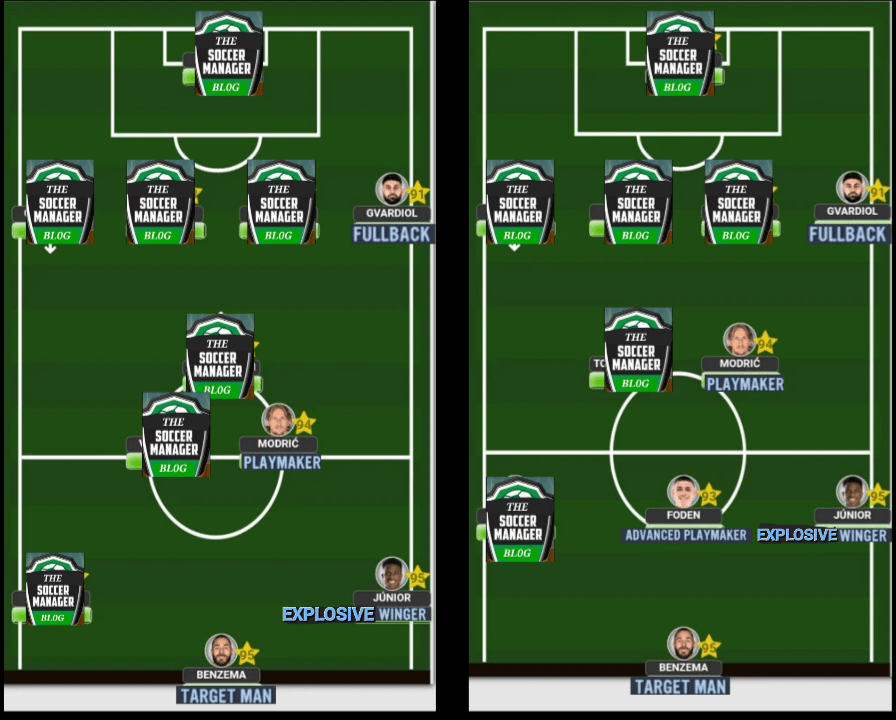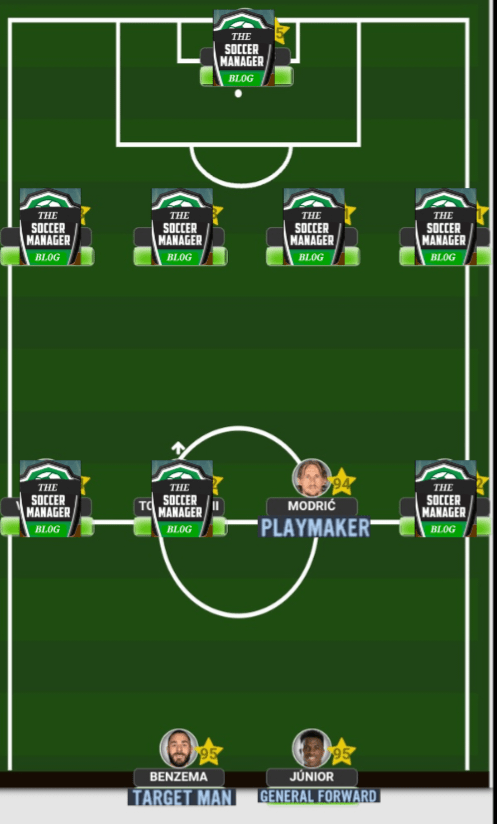 The beauty about Wide Forwards is that they do not need a host of different players around them to be at their best, with the keys being a ‘Wingback ‘who will provide the width on his side, and a Playmaker who will be providing him with most of the chances that Vini thrives onAs you already know by now, in order to get your ‘Wide Forward’ playing like a ‘Winger’, it will require that you play a ‘Fullback’ behind him so that Vini can keep the width out wide, with the other key teammates remaining the same In narrower formations, Vini seeks to get into more goal scoring opportunities via finding pockets of space where he can collect the ball and use his world class dribbling to run at defenders from his more central positionVini is the type of Forward that likes to showcase his ball mastery via dribbling, and since this is something that will be difficult for him to do playing as a F(C), I suggest you play him upfront with a strike partner, preferably a ‘Target Man’When playing Vini in a back 3 formation, I believe his ability to isolate himself against a defender will be one of your greatest advantage points within a match, so there should be a D(C) within your formation that has good range of passing (particularly that crossfield diagonal ball) which will cause a lot of problems for the opposition. Of course, the other players within the formation will remain the same