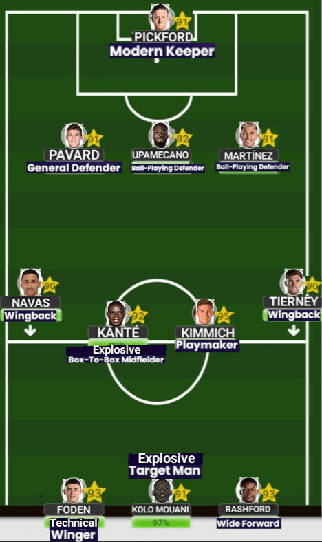 This formation is less focused on possession and more focus on creating overloads and isolations in wider positions. Therefore, The most important trait that your GK should possess will be his long ball and kicking ability and in Jordan Pickford, we have one of the best in the game from this regard. It is EXTREMELEY important that your back 3 is filled with players who are all mobile and have the ability to go 1v1 against thier oppostion during the defensive transition. If they have some pace then that is a bonus. I mention this to say that the D(C)’s outwide will need to already know how to play in the D(R,L) positions since they will be joining in on the attack whenever possible via making both ‘underlaps’ and ‘overlaps’ in addition to getting involved in build up play in controlled possession. From the 3 we have within this XI, Pavard and Martínez are both excellent at running with the ball, half space crosses, and, in Martínez’s case, progressive passes. Upamecano is a brilliant progressive dribbler who has elite dribbling skills for a D(C) and has really good short to mid range passes. He’s lacking in the long ball compartment, but that won’t be such a big issue since there is a player within the middle of the park in that solves this conundrum.