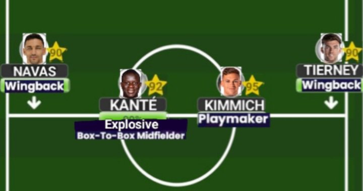 Since the main emphasis of this formation will be to play in the wide areas, there will be a huge importance on having a primary conductor who has the ability to play every type of pass on the planet and in Joshua Kimmich its safe to say we have the star on the team who could do just that. Since the centre of the park is a bit light, the player next to our ‘Playmaker’ has to be both an energetic one but also possess some defensive abilities since he’ll be tasked with doing a lot of the dirty work, and in N’golo Kanté we have arguably the best partner for Kimmich within this formation. The first batch of players outwide are solely about providing the width, and we’ll need to have players who are comfortable hugging the touch line for almost the majority of the game which is why we’ve chosen both Jesús Navas and Kieran Tierney who will play as traditional ‘Wingbacks’ within this set up.