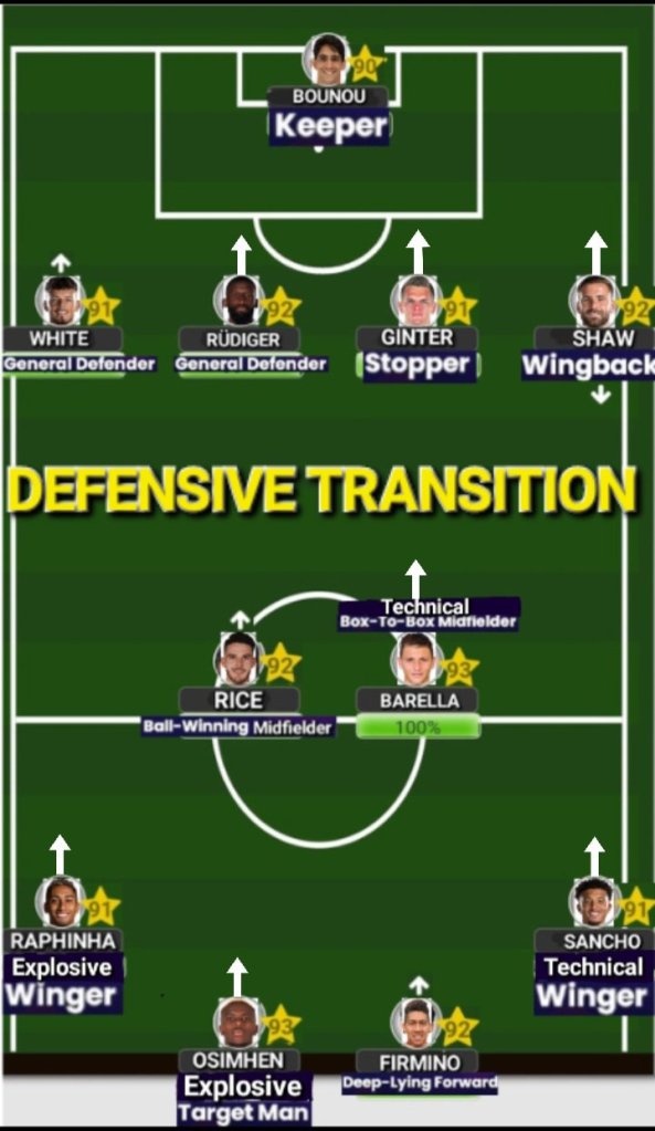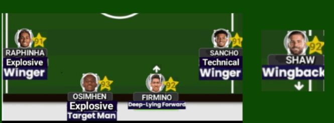 Here is where we get back to Shaw as his attacking prowess from the ‘Wingback’ position will allow the rest of this formation’s shape-shifting to blossom. He will remain on the flank providing the width from the left which will allow Sancho (update: rating lowered to ’90’) to cut inside and basically play as a ‘T.W’ who aims to operate centrally but will start outwide to give Shaw time to get into his attacking position. Raphinha on the opposite side will mainly keep the flanks alive and kicking by hugging the touchline, using his dribbling and attacking prowess to take on his defender and get crosses into the box. Roberto Firmino is also an integral part of this system since he will aid Jadon in giving Luke time to get up the pitch. In these scenarios, Bobby will operate in the ‘D.L.F’ position (mainly in between the lines) which will allow him to collect any early progressive passes and use his creativity to set up his attacking teammates. Ofcourse, he will also aim to attack the box since he is used to playing as a lone F(C). That leaves us with Vicky, whose power, tenacity, strength, explosiveness and finishing instincts will cause any back 2 or back 3 a whole heap of problems which will open up space for his teammates to play more freely.