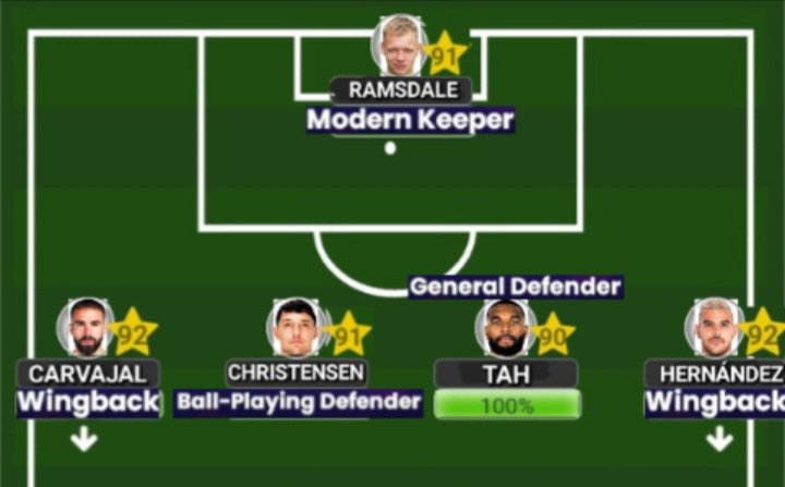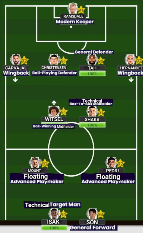 Starting out at the back, we have Aaron Ramsdale who, although might be struggling to make himself the no.1 at Arsenal with the addition of Raya, is an exceptional young ‘Modern Keeper’ who has great reflexes and is better than most on the ball. He will be important as this team aims to build up from the back, as the players within the central areas of the pitch are set up in a way that allows for a decent percentage of possession. The back 4 is filled with 4 players who are both technically and offensively savvy, with the D(C) 2 of Andreas Christensen and Jonathan Tah both having experience in playing higher up the pitch and are both very good on the ball. We have the expereince and high energy of Dani Carvajal on the right and the attacking monster that is Theo HernĆ”ndez (who is my personal favorite left ‘Wingback’ in the world) on the left. What separates both ‘Wingabcks’ is how comfortable they are on the ball no matter where they receive it on the pitch. Dani showcases his Spanish heritage in the way he can receive the ball and keep it with him at all times, while Theo… well, Theo is just a really freaking good player who possesses so much explosiveness that it makes him difficult to stop when in full swing. The play will normally start from the back 2, seeking to spread as far as they possibly can and form a connection with the double pivot in front of them which could cause what is known as a “box” (more info about this “box” will be explained shortly…). Both ‘W.B’s will also be hyper effective when it comes to maintaining the width and being atttacking outlets