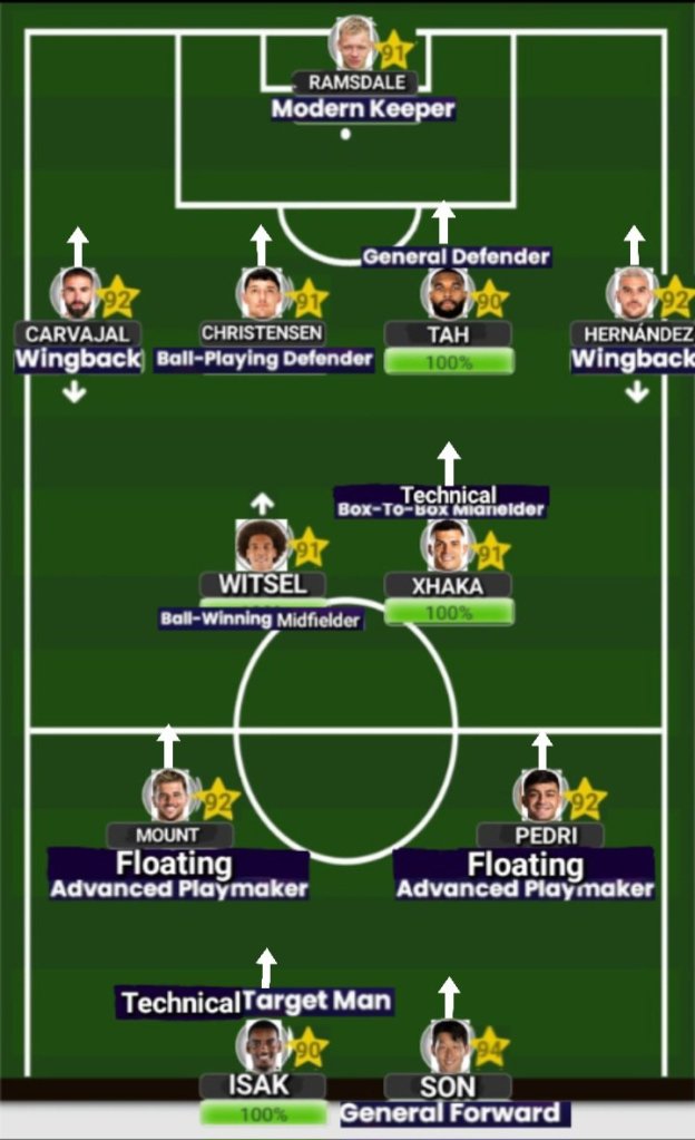 I hope by now you can see why I said that this team can potentially be a top 3 contender if the tactics are correct… And to top it off, we have a forward pair who basically does everything that you could ask for. Alexander Isak is our ‘T.T.M’ who will use his technical abilties to take the ball from almost anywhere on the pitch, link up with his other attacking teammates, and finish the chances that he gets. If there was any situation where the likes of Andreas, Granit, or Axel need to relieve pressure, then there’s always that pass over the top or in behind the defence seeking out the BEST off the ball attacker within the entire world, Son Heung Min. When it comes to controlled possession, Sonny will aim to either run in behind or drift off the left. He is the one anomaly within this team that doesn’t fit the rest from a technical point of view, but is necessary because he allows for a plan B (don’t get me wrong though, as Son is decent enough on the ball to play with them).