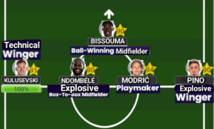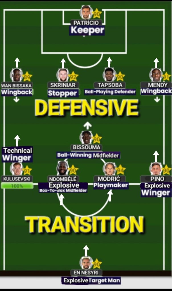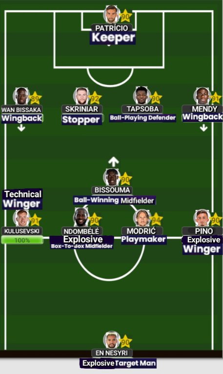 If it’s one thing that you’ll realize is that this team’s lacking a bit of stardust, but there is still some quality in here and we can clearly see that within the midfield region. Starting out with a man who is SERIOUSLY underrated and should jump from 90 to 92 in my opinion, Yves Bissouma is simply a glorious player to watch and he provides that all too rate trait of being a ‘B.W.M’ who is actually so good on the ball that he can also operate as a ‘D.L.P’. He will always seek to play that riskier progressive pass from deep while also aiming to recycle the ball, using his short passing capabilities. In front of him, we have the all out energectic approach of Tanguy Ndombélé and the superstar of this entire team, the Croatian Icon Luka Modrić who will be tasked with…. well, doing “Modrić” things. Outwide we have another good balance of two ‘Wingers’ who are on completely different scales in terms of what they provide on the ball. If you follow us on Twitter (@TheSMB23) you will know how much we actually are big fans of Dejan Kulusevski who we personally believe is going to be a top 10 player within his position in the next 3-5 years. He always wants the ball to feet and possesses serious levels when it comes to technical dribbling, while the young Spanish starlet Yeremy Pino, who is located on the opposite flank, is all about being a real headache with his quick and decisive dribbling as well as his eagerness to always make that dangerous ‘out to in’ run on the blindside of his opposition