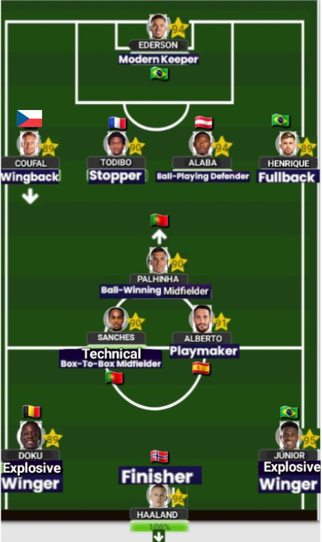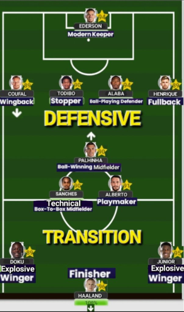 This formation has an attacking bias and I won’t shy away from saying that is indeed the case since one of the main reasons behind the inclusion of some of the earlier players we’ve discussed so far is down to the front 3 that we have at our disposal… Starting out left, we have a potential Balon d’or winner in the Brazilian danger man Vinicius Júnior who has the left flank all to himself since Henrique will rarely be overlapping him, and although this might cause a potential double team against Vinicius, you simply have to trust that he has the know-how to get pass them (trust me when I say that he does indeed have the ‘know-how’!)… If you thought one ‘Explosive Winger’ was enough then prepare to be bamboozled as we also have the Belgian starlet who has started his career at the Treble winners in the best way possible. Jeremy Doku is one of the very few old school ‘Wingers’ still around in the modern game and he will showcase his love for ‘stop and start’ dribbling as he isolates his Fullback and take them wherever he wants to. When it comes to who is going to be more of a threat between both ‘Wingers’, you’d be surprised that it’s actually Doku since he is more unpredictable, while Vinicius is more of an efficient player in terms of his dribbling patterns as he tends to be more clinical and efficient while Jeremy will overall cause more headaches for each Fullback he comes up against (this is to be viewed from the perspective of an ‘out and out’ Winger). Oh, we’ve also given Jeremy an ’89’ rating beacuse we expect him to increase due to his stellar start at City.