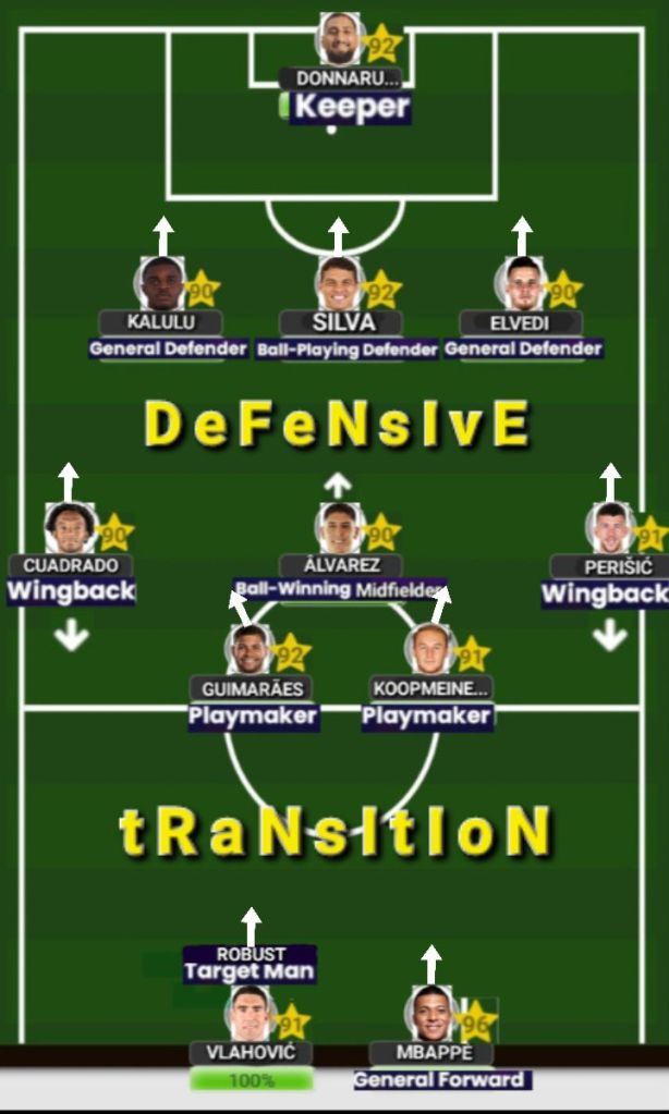 In front of Donnarumma, we have the 3 D(C)’s who have been granted the opportunity to be the first 3 up within the ‘5 at the back’ series. The man in the dead centre is a player that needs no introduction, a player who laughs at the face of the stereotypical concept that players of his age shouldn’t be playing at such a high level as well as a man who simply oozes with class every single time he steps on the pitch… Thiago Silva (update: rating decrease to 91) is the definition of a proper Rolls Royce defender, and with so much protection around him we can expect that he’ll go above and beyond as the leader within the pack. On both sides of him, he will need to have players who are athletic, since 39 years old means a Pace of around 60, so we have two D(C)’s who fit the bill and will be doing more of the aggressive defensive work in the French man Pierre Kalulu, and the Swiss man Nico Elvedi. Kalulu is yet another French D(C) who is very good on the ball and possesses a lot of that all too important pace that will be needed to aid Thiago Silva’s aging legs. Kalulu also posseses a lot of power and tends to win most of his ground duels; While in Nico Elvedi, we have a former D(RLC) who now only operates as a D(C), but those instincts haven’t gone anywhere so he is more than comfortable playing in that D(LC) position where he will primarily be on his weaker side (but it won’t show… ).
