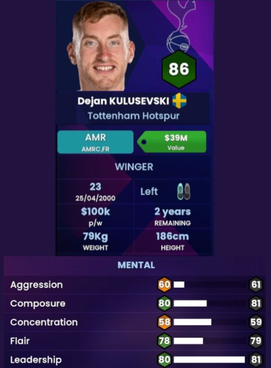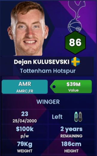 The twinkle toed Swedish…A player whom Juventus is probably hitting their head in disappointment based on the fact that he truly got away from them. A ‘Technical Winger‘ who happens to also be one hell of a hardworking player who has took to the English game like duck to water. We personally believe that Dejan Kulusevski will be a top 5 player within his position by the time he hits his prime (which is normally around the age of 27/ 28 for players within his position). Dejan is a Swedish international who is one of the key players within his national team and is one of the lads who’s expected to bring them the goal contribution that is necessary for both European and World Cup qualification. Alongside Alexander Isak, Kulusevski is the go to player, and with the way in which he keeps on progressing at Spurs and with a highly attack minded Manager in Ange Postecoglu, it’s safe to say that our prediction of his peak might be a 🤬 gem!
