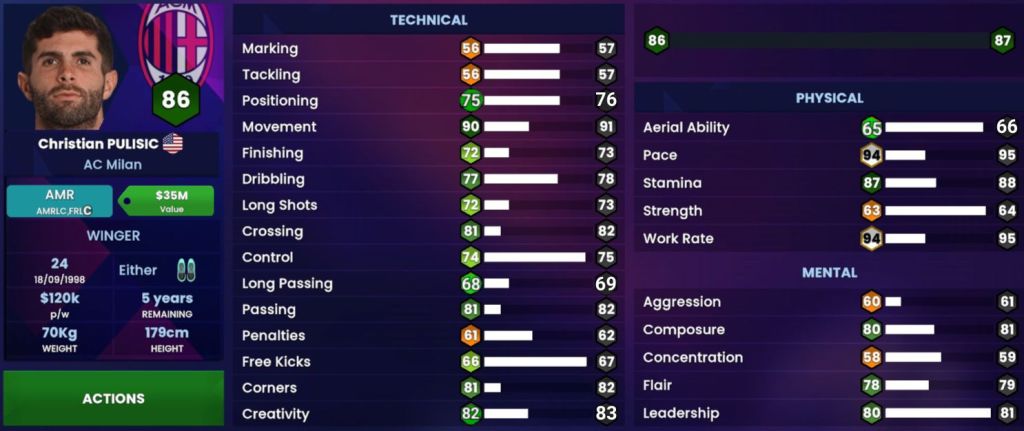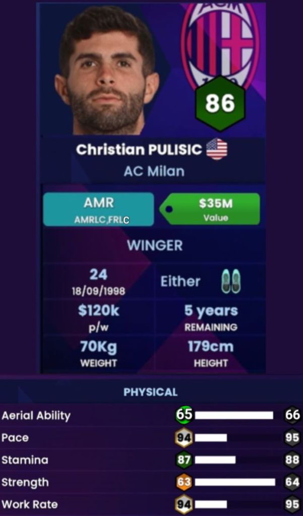 The one thing that does need an increase is his Aerial Ability because although Christian only stands at 5’10”, he is someone who is considered an intelligent header in terms of the timing of his run into the box in addition to his timing of his jump to head the ball. He is similar to players such as Sadio Mané & Diogo Jota who are relatively short in stature yet good in the air (but Christian is not as prolific as these two).
