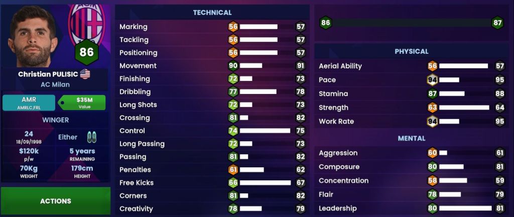 This is a very good opportunity to demonstrate how each Mental Attribute explains what to expect from a player like Christian Pulisic within this compartment of his game. Although he is a very hardworking chap, his Aggression is an indication of a player that doesn’t necessarily want to get too involved in the ferocious battles that football tends to provide (which is a very familiar trait amongst ‘Wingers’); His Composure represents how neat he is when the ball is at his feet and for Christian in particular he is a ‘Winger’ that enjoys freedom and is quite effective when receiving the ball in between the lines, in addition to showing calmness (which is a synonym of composure) whilst around the penalty box; although a wide player, it can be said that Christian is not your typical ‘Winger’ from the perspective that he has played in deeper roles within his career, so that means he has had to display some form of Concentration to have played at ‘Wingback’ in the past and this had to be an indication that he had some level of Concentration and wasn’t simply down to Tuchel wanting to add an extra attacker into his XI; Now, his Flair represents a Wide Player who can get past his opposition if he needed to, but he isn’t someone that wants to get isolated with a ‘Fullback’ on a regular basis. He’s more of a ‘Winger’ who likes to float, make runs in behind and impact a match via obtaining assists and goals. Lastly, although Christian is currently the Captain of USA, that decision was probably down to him being their best player and one of the stars who were playing in one of Europe’s top 5 leagues. Also, it could have been a decision made out of a need to apply that extra pressure so that he can improve as a player with the added responsibility. So, all in all an ’80’ for his Leadership attribute is understandable.