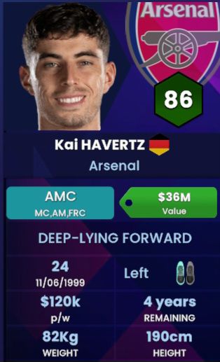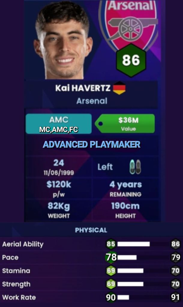 Next, we have his positions… Gone were the days where Havertz was an exuberant 18 year old who would start off the right and tuck in when his team has possession of the ball. One of the major reasons why this worked was because he was young and would do anything to get in the team. Now, he’s a bit full of himself and although he has an exceptional engine (more on that later), Kai simply cannot be bothered with starting off the right which is why we’ve given him the central three of M(C), AM(C), and F(C) to play in. You can call him a “Centre Man”…