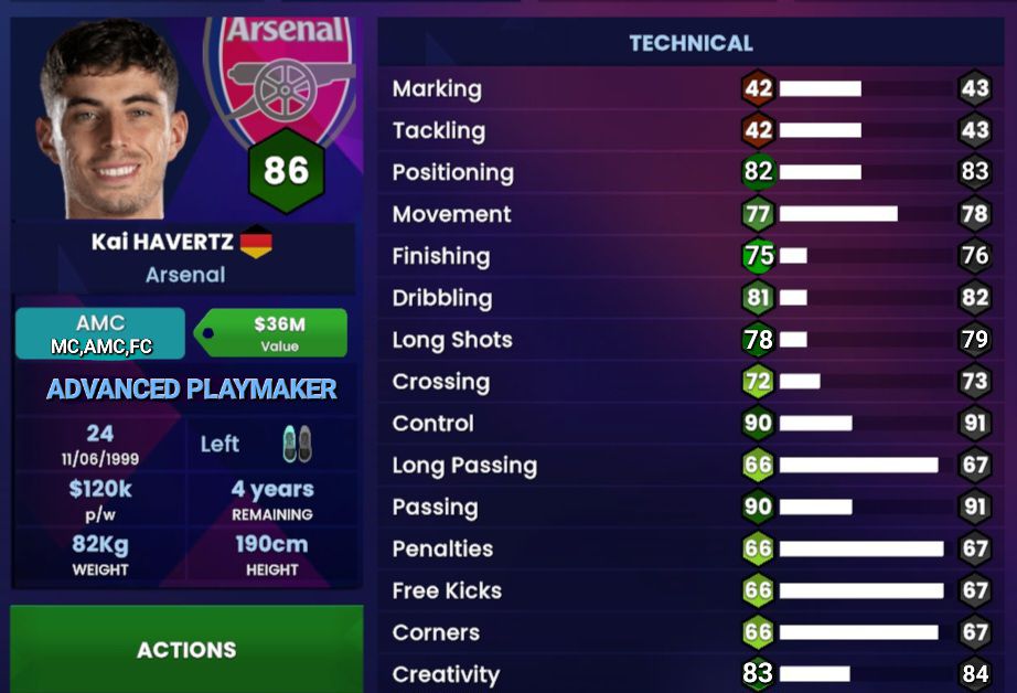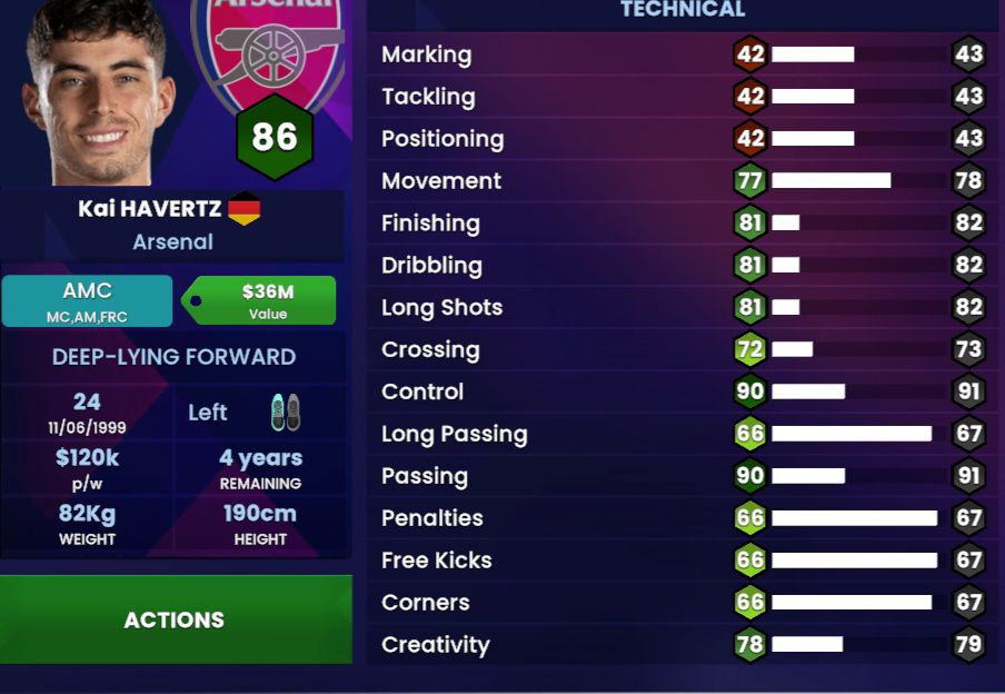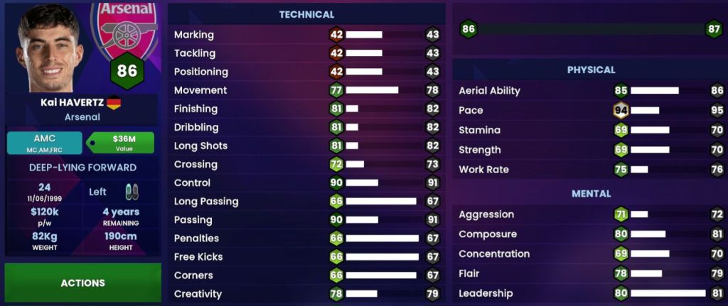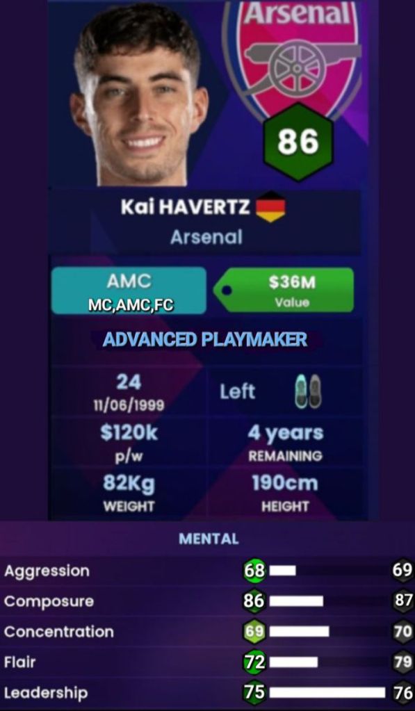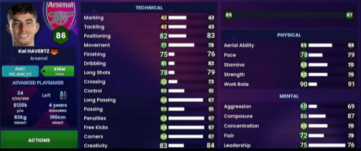 In terms of his technical attributes, the gripe for seeing players not having proper Positioning continues… If there’s one thing that Kai does well is the fact that he is almost flawless in placing himself in the right place to receive the ball or to drag opposition players out of their comfort zone. The only reason why it’s just ’82’ is because it has been improved from a ’42’ (which by itself is simply ridiculous…π€¦ββοΈ); he may have shown some goal scoring instincts back at Leverkusen, but ever since he’s left he has not been prolific enough to warrant that level of Finishing, so we’ve took some of it off…; Havertz also doesn’t score a lot of goals outside of the box, so won’t really say he’s that good at Long Shots…; What he is though is a very creative player who has that ability to create for himself and for others and is deserving of a higher Creativity attribute.