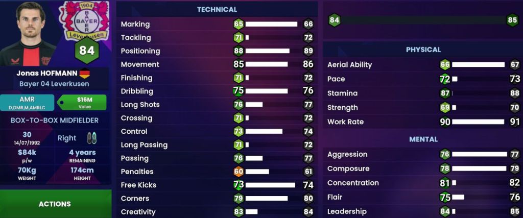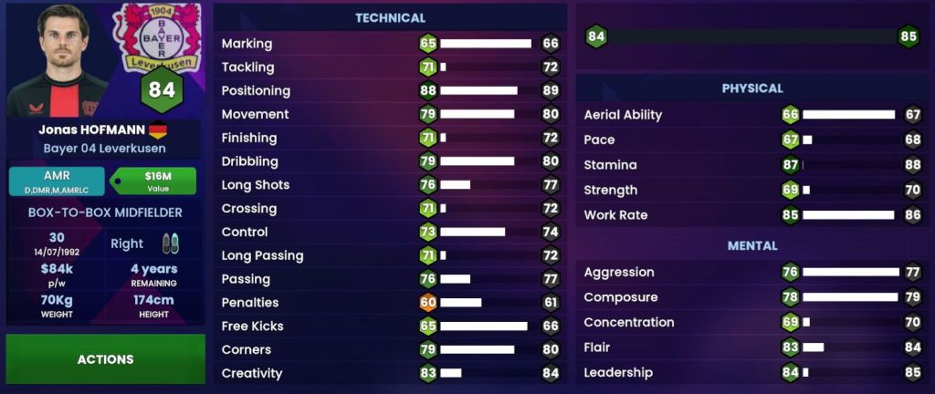 Straight out the gate, we have what is considered tradition in terms of the attributes of a versatile ⚽ player… Jonas is a compotent passer, dribbler, and set piece taker without being too spectacular. His best attributes are his Positioning (which should always be on the top of every player’s list), as well as his off the ball Movement which is conducive of someone who spends a lot of time playing on the right.