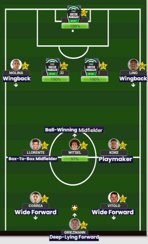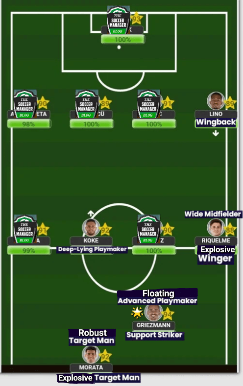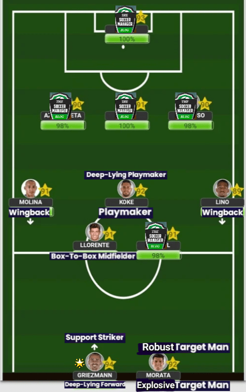 A Manager’s note: Before we move on, the main reason as to why the ‘Wingers’ playing alongside Antoine are Explosive is because ‘Technical Wingers’ don’t stay outwide for the entire match and have a tendency to want to drift inward to get on the ball more… This drifting will cause congestion in central areas of the pitch and will nullify Griezmann’s impact on a match.Additionally, playing an ‘Explosive’ or ‘Robust’ Target Man up front rather than a ‘Technical’ Target Man (like a Benzema, an Isak, or a GonΓ§alo Ramos) is crucialsince ‘T.T.M’s’ like to drop deep and collect the ball which will cause positional issues for Antoine since they’ll likely be getting into each other’s way.