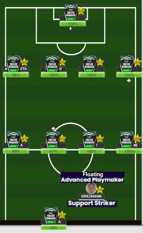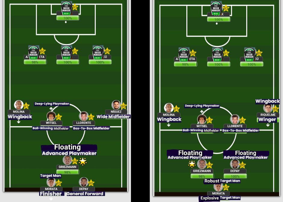To get the absolute most from Antoine requires that you place players alongside him which will allow him to thrive since if Antoine thrives the team generally will, too. So, ‘4-4-1-1 Antoine Griezmann’ needs the freedom of the park to go wherever he wants without any sort of strict responsibility. The best players to assist him in this pursuit will be a ‘Playmaker’ or ‘Deep-lying Playmaker’ who will be the main creative hub of the team thus allowing Antoine to be secondary in command, an ‘Explosive Winger’ or ‘Wide Midfielder’ who will provide the width needed to stretch the opposition and allow Antoine to make runs into the box to potentially get onto the end of a cross, a ‘Wingback’ who overlaps and gets into the attacking third to get even more crosses into the box, and an ‘Explosive’ or ‘Robust’ Target man who will be the MOST IMPORTANT teammate of Griezmann since he will have to possess the strength and hold up play required to link up with Griezmann as well as getting unto the end of things when the Frenchman decides to get into his creativebagThe 4-2-3-1’s are quite similar to the 4-4-1-1 in terms of what is needed around Antoine, but there are some slight changes that need to be considered. First off, the major difference between the ‘A’ and ‘B’ sides is the proximity of the players whilst on the pitch, so the ‘A’ will need to have two flying ‘Wingbacks’ bombing foward to provide the width, while the ‘B’ will only require one ; The double pivots are quite similar for both formations as it is important that there is a creative player alongside an industrious and defensively astute player so that Antoine can stay relatively higher up the pitch and have both a creative spark and defensive protection behind of him ; The major difference between both formations is who partners Antoine in the 3 behind the main F(C), as the 4-2-3-1A allows for more freedom in rotation, so another ‘Floating Advanced Playmaker’ who’s on the same wave-length as Antoine will be crucial, while an ‘Explosive Winger’ will be necessary in the 4-2-3-1B as there is less capacity for roamers in this formation, therefore the ‘Explosive Winger’ will perform a similar role as within the 4-4-1-1. Lastly, we’ve already mentioned that wherever Antoine goes a T.M flows, but we’d like to inform you that in the 4-2-3-1 Antoine’s starting position will be sligtly deeper so he will be tasked with being more creative in terms of aiming to be the man who makes the final pass towards the potential goal scorer, but will also seek to do Griezmann like things such off the ball Movement and positioning himself intelligently within the penalty areaMy least favorite position for Antoine, although he can play off the right it’s still a very limiting role for him since he’s now 33 years old and although still hardworking, he doesn’t want to be receiving the ball around the touchline at any time during a match. He plays nothing like a ‘Mohamad Salah’ and won’t be at his best in this position. But, if you happen to want to play him out wide then there is a way to set up the team to get him playing as best as he possibly could. In order for us to do so, we will need a lot of legs around Antoine which is why both the 4-2-3-1A and 4-3-3A have a necessity for a ‘Box to Box’ Midfielder. This ‘B2B’ needs to have extreme levels of Stamina and Workrate since their primary job is to cover the ground that Antoine doesn’t due to Antoine naturally playing in central positions throughout the entire match. And this central positioning is exactly why the player on the left has to be an ‘Explosive Winger’ holding the width in front of a D(L) that plays like a ‘Fullback’ not seeking to overlap, while the D(R) behind of Antoine should be a ‘Wingback’ who provides the width off the right. We also need a defensively good player in the center of the park for the 4-2-3-1 A since it is a more attacking formation than the 4-3-3A
