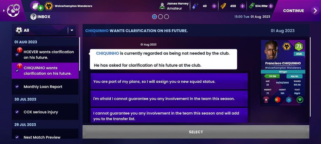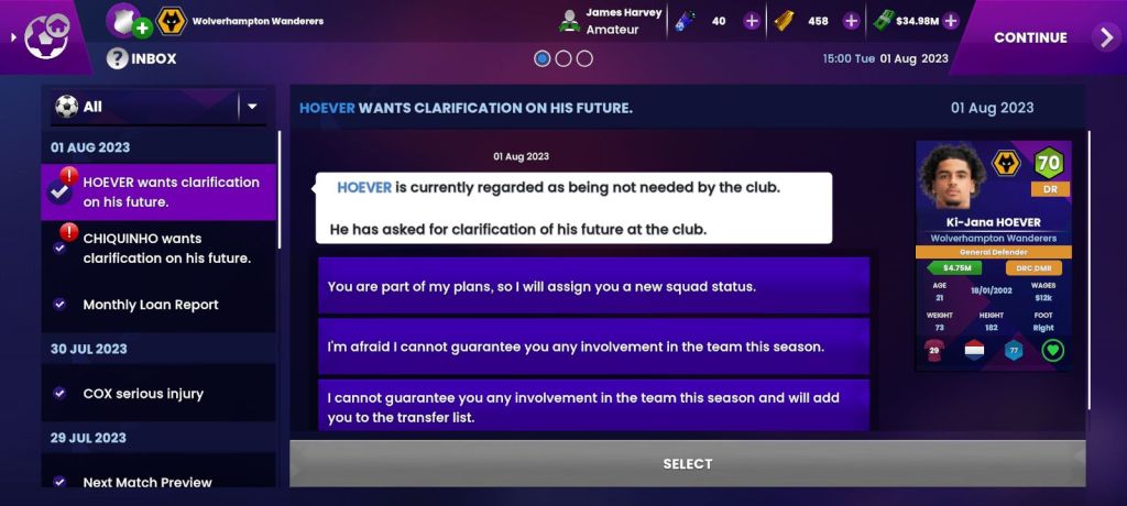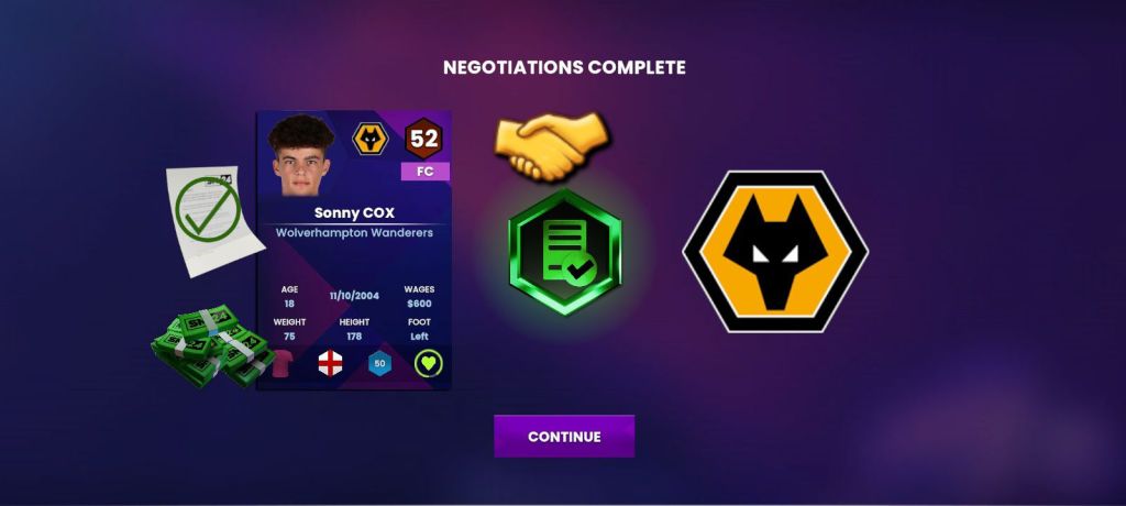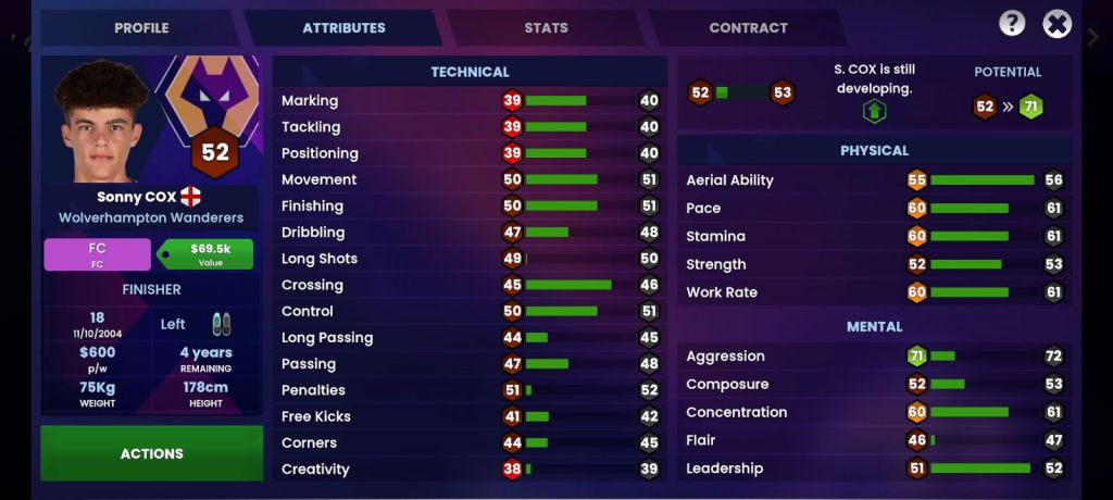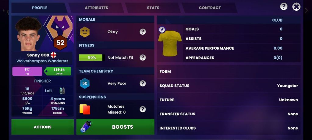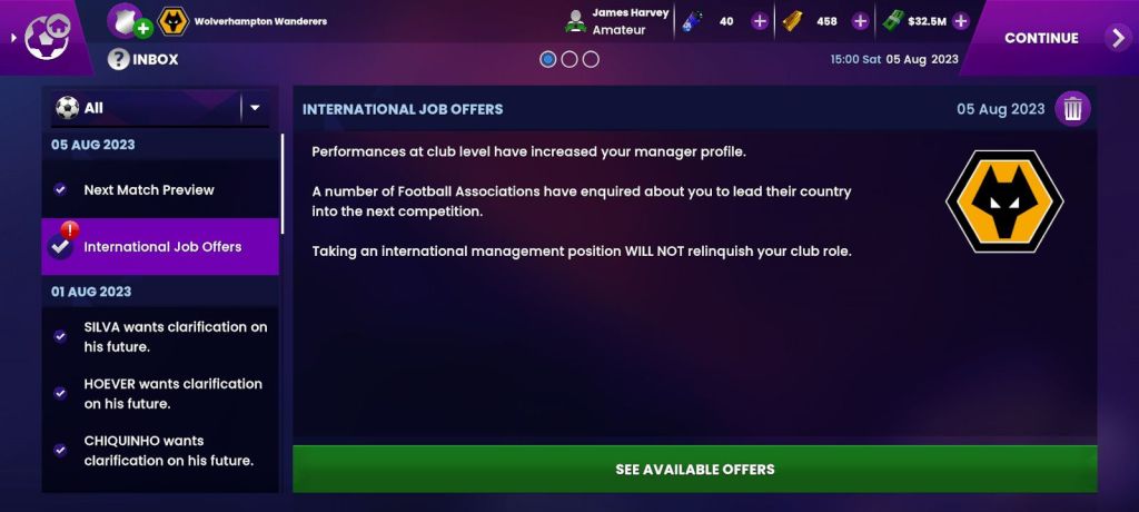 Alright, so we have a home-grown youngster who can do a job for us as a back up player and 4th choice F(C). Alongside Matheus Cunha, Hwang Hee-chan, and the returning Fábio Silva (whom we also brought back from his loan stint in Scotland). We have 4 decent Forwards with at least two of them good enough to play for any of the ‘big 6’ if they ever needed a back up player... Both Hwang and Matheus are similar players who bring basically the same thing to a game in their ability to play multiple roles in the same match, while Fábio is our ‘Technical Target Man’ who excels at link up play and creativity. What we lacked the most is an out and out ‘Finisher’ who will stay on the shoulders of the opposition’s back line in an attempt to stretch them and create space for his teammates in addition to seeking to score goals himself. Based on what we currently see within his attributes, Sonny is obviously still developing but has the right traits of a proper ‘Finisher’. So, we’re definitely looking forward to helping him with his development!Oooooo, we’ve got ourself a prize! 😋Here we take a look at our Youth Academy! A set of youngsters whom could possibly become superstars of the 29/30 season! Well we hope so, since these ratings don’t bring that much hope… 😅A part of choosing our first team is that there were quite a few players that we’ve chosen to bring back from loan spells since the intention was to never sign any first team players. Unfortunately, once you’ve chosen to send a player out on loan they are immediately placed as “not needed by the club” and will therefore be requesting a newer role for the sake of their morale… This lad right here will possibly play an important role on the right hand side of our back 3, but for now we’ll give him a ‘rotation role’ since we don’t want to get his hopes up too high then next thing he doesn’t perform to expectations… We’ve got International Management offers! 😯Although tempting, we have 0 intentions of becoming an International Manager anytime soon. Our sole focus for now is to do everything to keep Wolves within the top tier… 🤞Our final Pre-season friendly is underway! We’ve got quite an intriguing opposition in the Italian side Fiorentina… 🤔This decision might surprise many of you Soccermanagerites, but once we’ve picked a squad we tend to stay with our decision regardless of overall rating. Bruno Jordão may have a indistinguishably low overall rating of 65, but he has the right kind of attributes that will make him affective as a rotational/ back up option…
