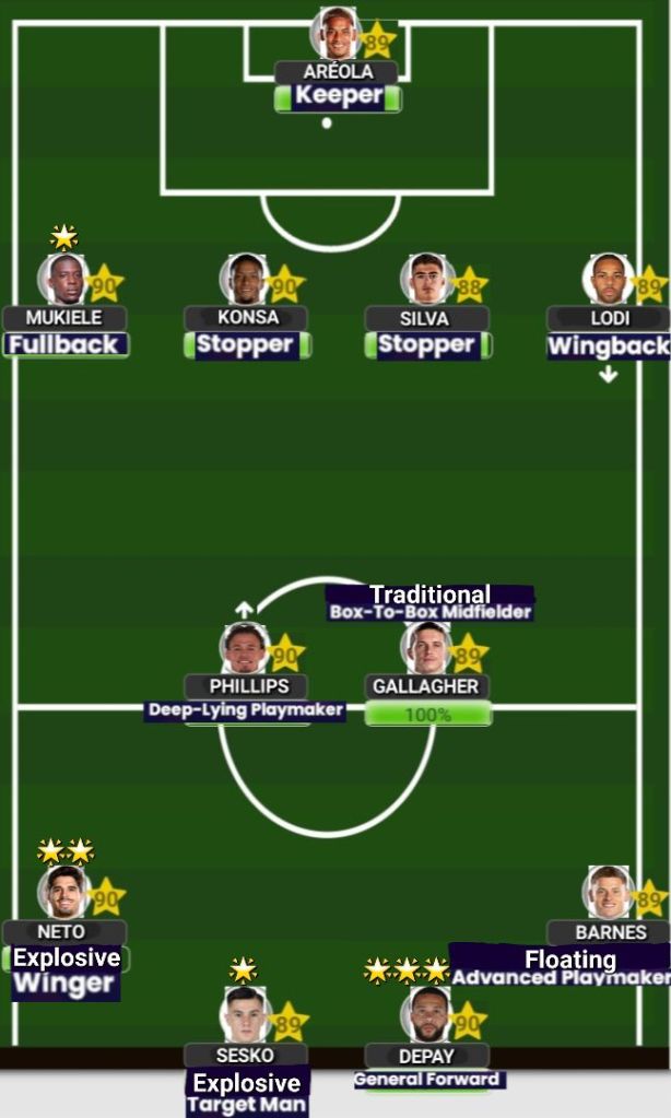 We start off on the right where the Portugese international Pedro Neto will be utilizing all of that explosive dribbling to bypass his fullback like clock work. He will also provide most of the width off that right hand side with Mukiele and Gallagher in support. Off the left, we have the quite underrated Swiss knife that is Harvey Barnes, who can play so many varying roles and would probably be closer to getting an Engalnd call up if it wasn’t for persistent injuries. In this XI he will have the license to go wherever he wants on the pitch to impact the match with most of his damage potentially coming in that left half space and in and around the 18 yardΒ box. In Benjamin Sesko, we have a ‘Target Man’ who is shaping up to be the closest competition to Erling Haaland when it comes to being a natural “No.9”. Sesko has ZERO weaknesses as a F(C) but is still developing so needs the time to continually improve his game. He could’ve played any of the 3 types of Target Man roles (Robust, Technical, Explosive), but for the sake of this team, he will mainly operate with his back to goal, looking to make sharp runs in behind, latch unto the ball and run at his opponents and always being an available target in the penalty area. Memphis Depay tops off this team as undoubtedly the main superstar who is expected to produce high performances week after week. As our ‘General Forward’, Memphis possesses a similar amount of freedom as Harvey with the caviate being that the Dutchman is way more clinical. He won’t neccessarily run with the ball, but will drop deep and aim to be an extra creative spark, while also using his great movement to score goals himself. Memphis is also one of the best F(C)’s at operating in between the lines, and with all of that space between the midfield and attack to be exploited, he may believe he’s died and gone to tactical heaven
