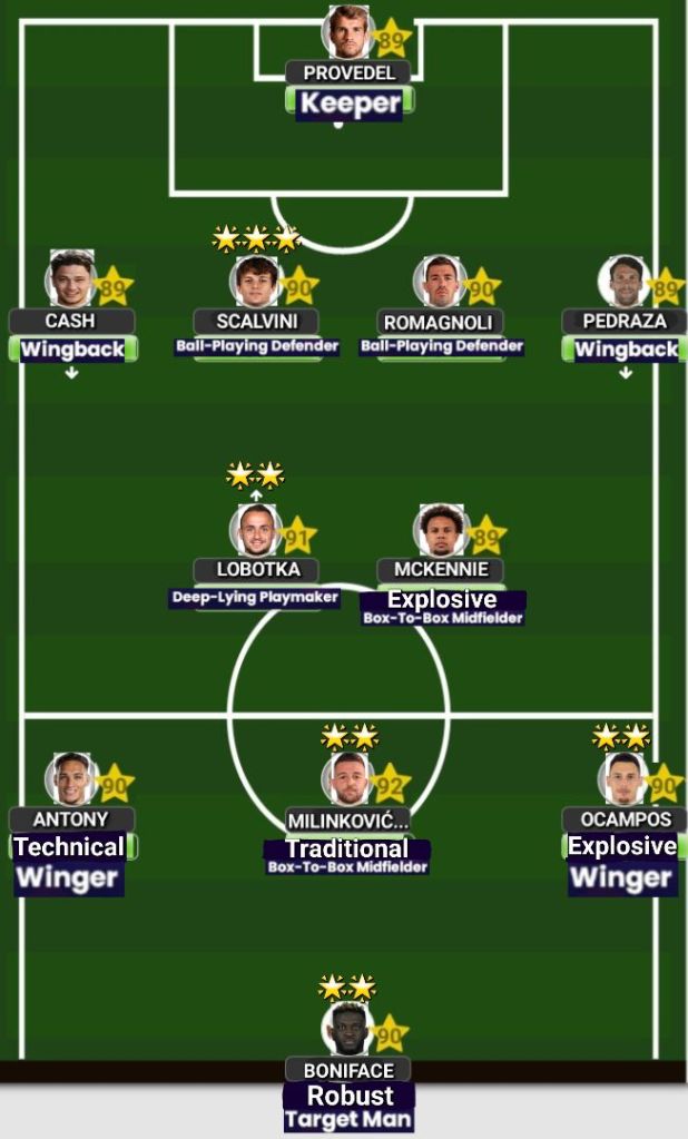 We’ve chosen to give the Slovakian the captain’s armband, with Romagnoli being the V.C, Antony and Lucas Ocampos will be sharing the set pieces, Lobotka spraying it from deep, Boniface racking up the goals as the PK taker as well as being the main focal point of the team with Milinković-Savić being a worthy and dangerous decoy.