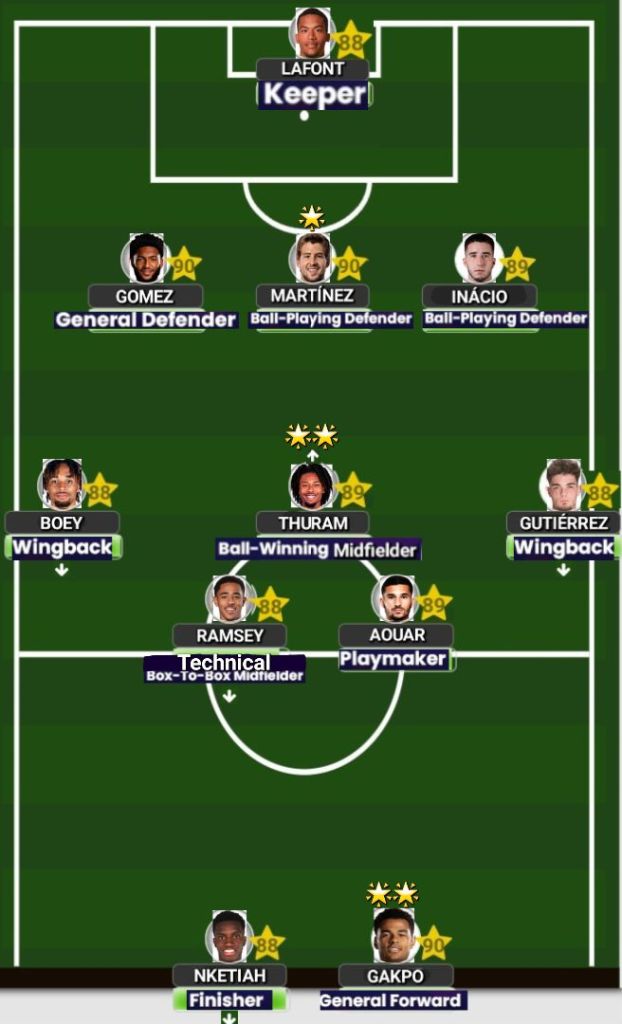 The Spanish D(C) leads this team, with Joe Gomez as his understudy; Houseem Aouar will utilize his set piece specialist badge as best as he can while also creating the most chances for his team. Cody Gakpo will be responsible for the penalty kicks, while Eddie will lead the line as best as he can.